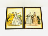 Here are two Vintage Silk French Antique Fashion Framed Prints. These measure 9 1/4” tall by 7 1/4” wide and show ware, one has a bit of damage to the bottom on the frame the other has an indent in the silk, see pictures. These display well!