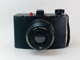 Here is a AGFA Pioneer PD16 rollfilm camera manufactured in Ansco's Binghamton, New York, factory beginning around 1940 till 1943. This is the 616 model which produces a 2½” x 4¼” negatives. The camera is metal-bodied, with a resin-plastic lens barrel. The Pioneer uses a curved film plane in an attempt to better match the field curvature of its one-element lens. Until 1943, the company was still using the Agfa Ansco brand, and so this original model has Agfa Pioneer above the lens. The shutter button is on top of the body, and a lever under the lens to switch between 'I' (ca. 1/50 sec.) and 'B' shutter mode.