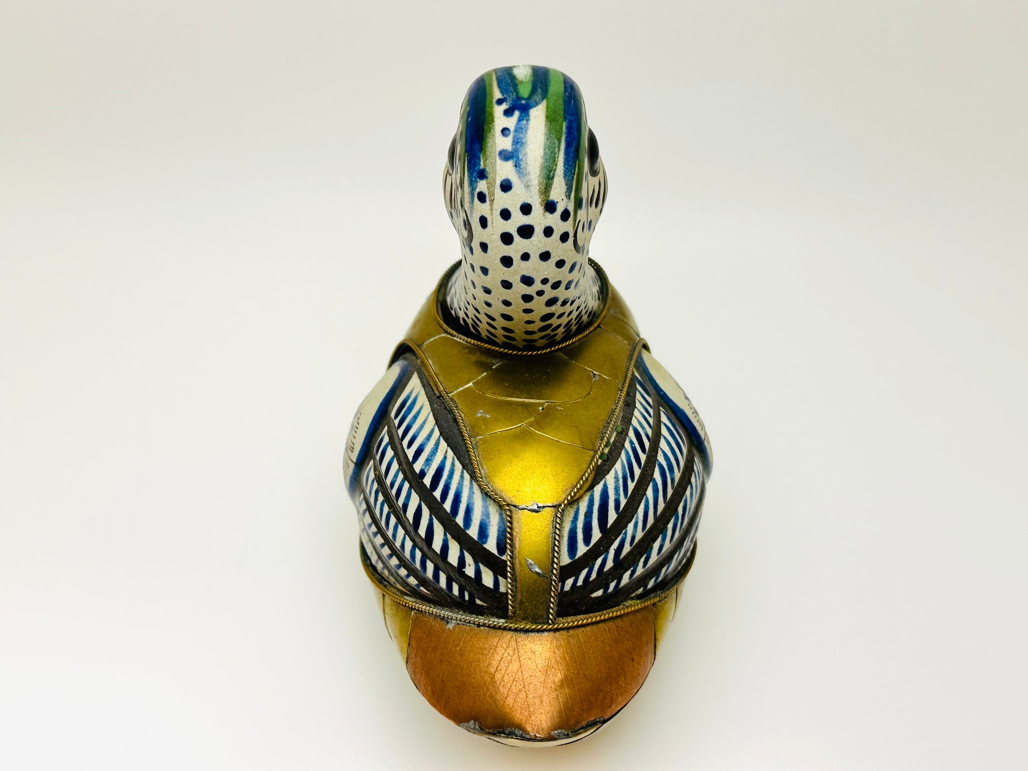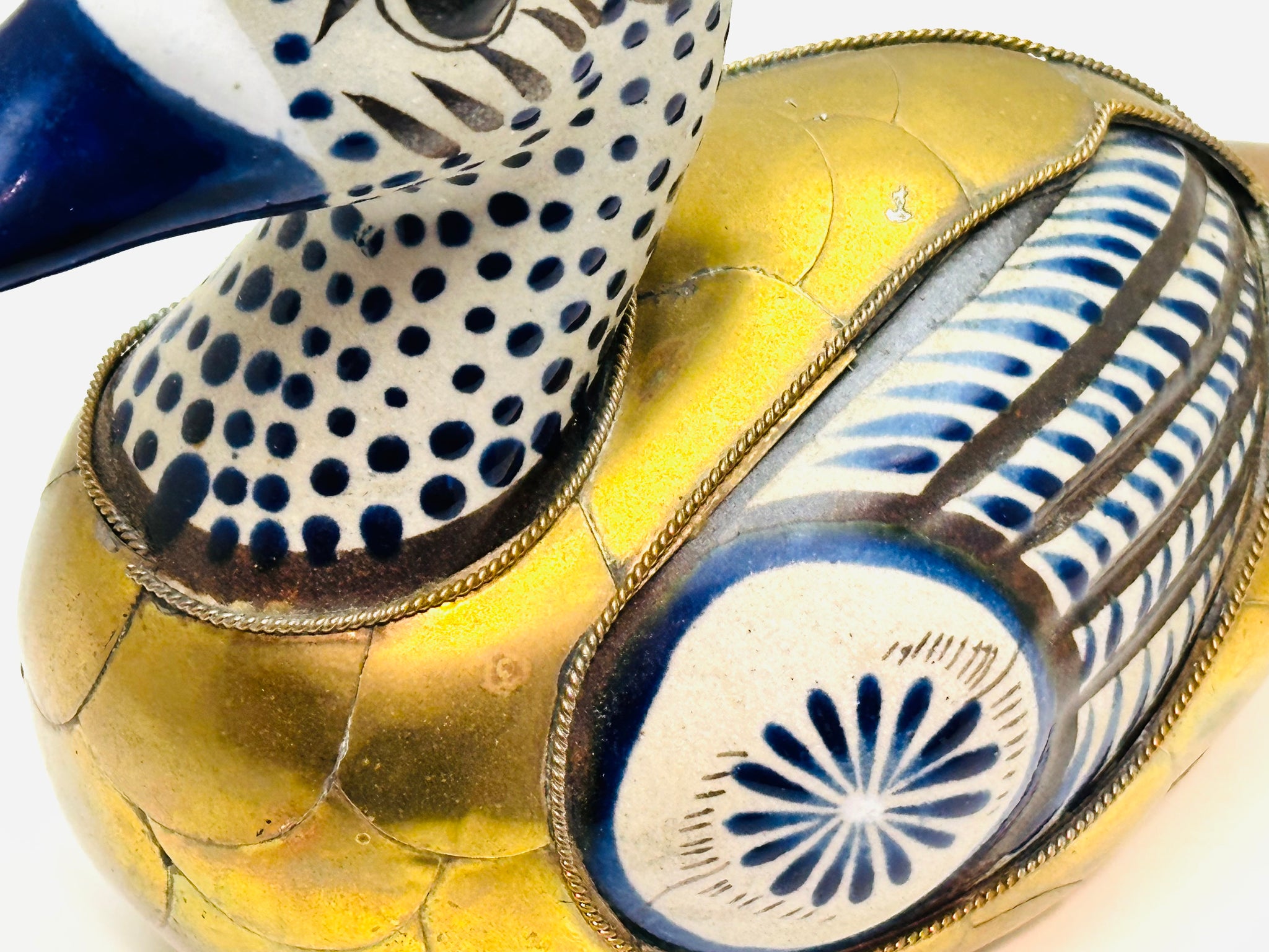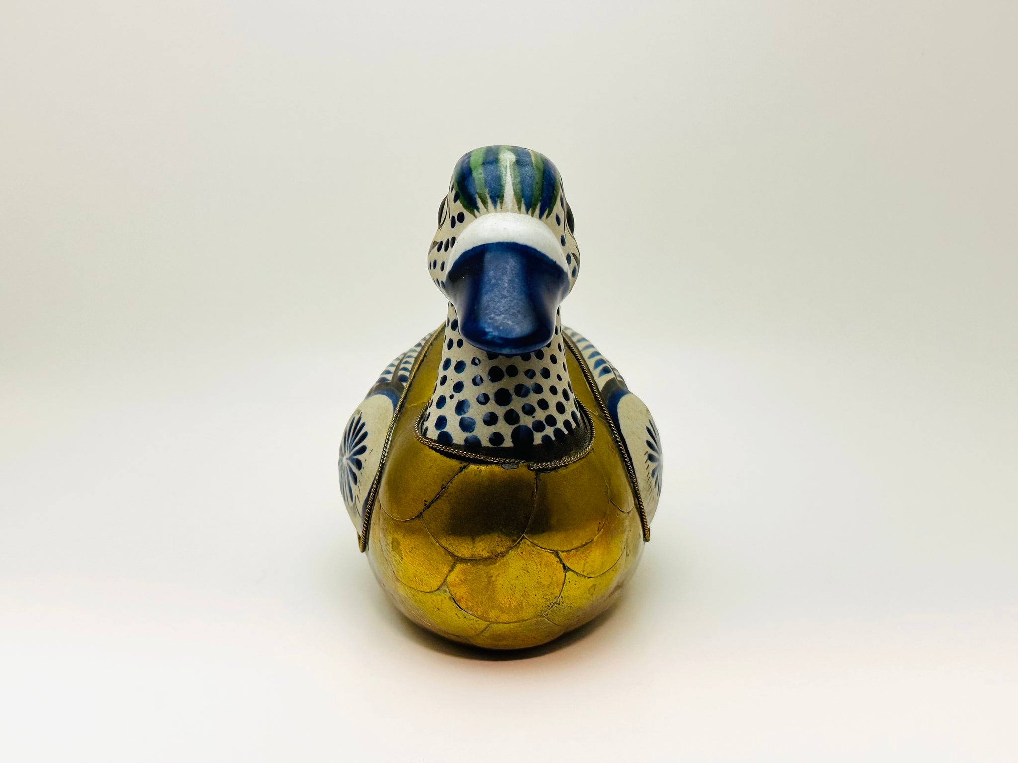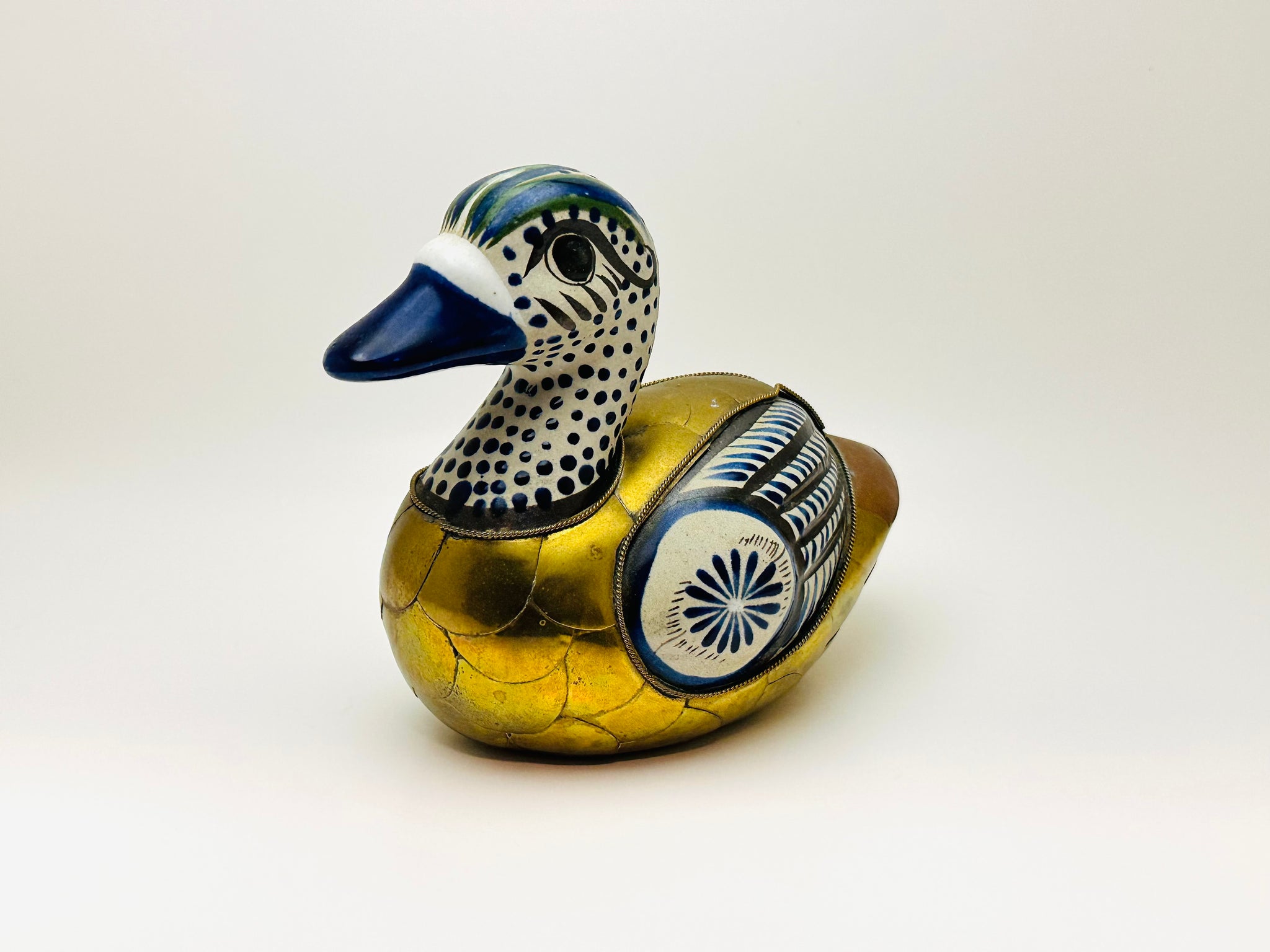 Here is a beautiful vintage brass and stoneware pottery duck sculpture inspired by Mexican artist Sergio Bustamante.